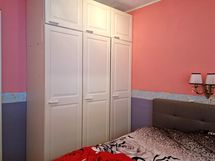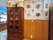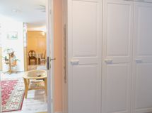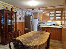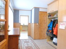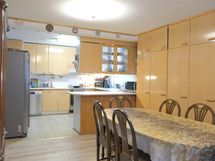 Keittiön jatkona on tilava ruokailutila, jossa täyskorkea iso kaapisto. Rosteriset kodinkoneet.