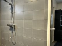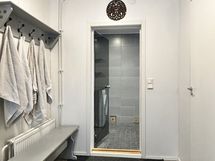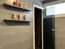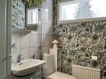 Keittiöstä kuljetaan talon länsiosaan, jossa sijaitsee vuonna 2018 remontoitu kylpyosasto puulämmitteisellä saunalla, pukuhuone, erillis-wc sekä käytännöllinen varastohuone – paikka arkkupakastimelle ja marjasadon säilömiseen.