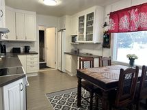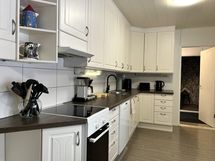 Vaalea keittiö on päivitetty 2000-luvulla ja sen lattia on uusittu kestävälle vinyylille vuonna 2019.