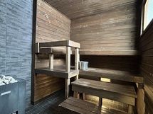 Kylpyhuone on ajattoman tyylikäs harmaan sävyineen ja saunassa kiukaan taustaa korostaa kivijäljitelmälaatta.