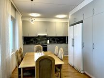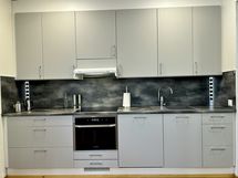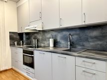 Keittiö on uusittu ja siihen on todella panostettu. Induktiotaso, erillisuuni ja samaan kokonaisuuteen integroitu mikro, kulmiin sijoitetut käytännölliset pistorasiaratkaisut sekä kaapistojen toimiva hyllykkösisältö tekevät keittiöstä paitsi näyttävän myös erittäin toimivan.