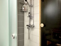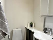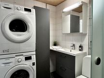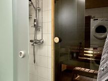 Kylpyhuone on tilava ja huolella suunniteltu: toinen wc-istuin, kauniisti huurrelasinen liukuovellinen suihkuseinämä, tilat pesutornille ja pyykkikaapille sekä reilusti lasku- ja säilytystilaa.