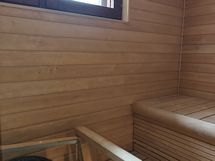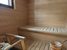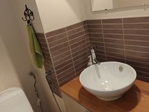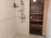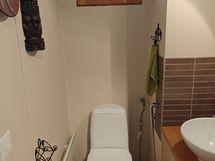 jossa pesukoneelle paikka ja pesuallas. Varustus: pesukoneliitäntä, lattialämmitys, suihku, peili. Varustus: bidee-suihku.