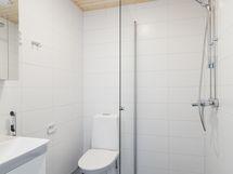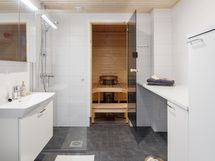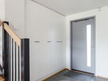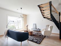 Kotoisa viiden huoneen paritalon puolikas, jossa on kaksi kylpyhuonetta, sauna ja terassi. Sisäänkäynnin yhteydessä on ulkovarasto. Heti eteisessä on tilava kaapisto sekä käynti alakerran kylpyhuoneeseen, jossa on pyykkikaappi, varaus pyykinpesukoneelle ja kuivausrummulle. Lisäksi kylpyhuoneen yhteydessä on sauna, jossa on moderni pyöreä kiuas.