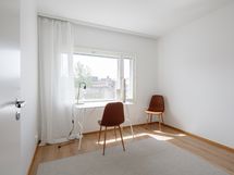 Yläkerrassa on kodin neljä makuuhuonetta, joissa kaikissa on yhden hengen sängyn lisäksi tilaa vaikkapa työpöydälle tai lipastolle. Isoimmassa makuuhuoneessa on koko seinän kattava kaapisto sekä ranskalainen parveke. Yläkerrassa on makuuhuoneiden lisäksi kodin pienempi kylpyhuone, jossa on vessa ja suihku.