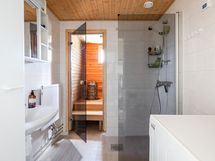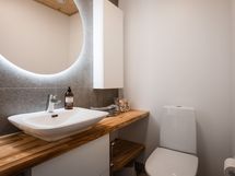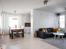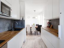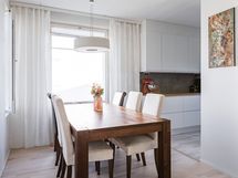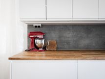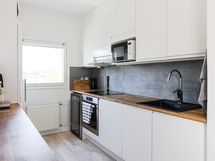 - Keittiön varusteet: Jääkaappi ja erillinen pakastin. Liesi: Induktioliesi. Työtason materiaali: Puu.