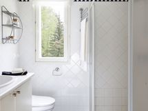 Varustus: wc-istuin, suihkukaappi, peili, kiinteät valaisimet, kylpyhuonekaapisto.