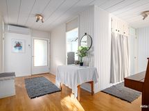 - Kuvaus: Lattia laattaa ja seinät puupaneelia. Lämminvesivaraaja lauteiden alla. .