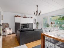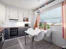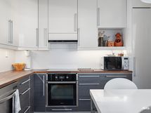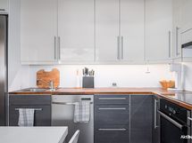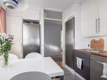 - Induktio liesi, liesituuletin/huippuimuri. Täyskorkeat jää ja pakastekaapit, astianpesukone. Tasot täyspuuta. Lattia vinyylilankku.