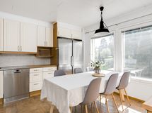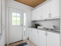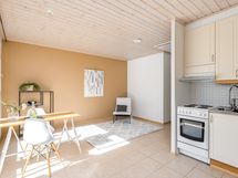 - lattia klinkkeriä, seinät maalattu, jääkaappi/pakastin, puuhella, keraaminen liesi, uuni, liesituuletin omaan hormiin