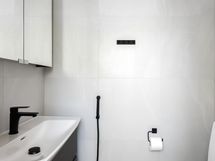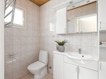 - Pesutilojen kuvaus: lattia ja seinät kaakeloitu molemmissa asunnoissa, suihku. Erillisen WC:n kuvaus: isommassa huoneistossa kaksi erillistä wc:tä, lattia ja seinät kaakeloitu, allaskaappi, peili, yläkerrassa wc-istuin, kaksiossa wc kylpyhuoneen yhteydessä.