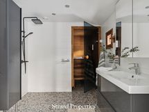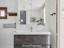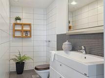 - Pesutilojen kuvaus: Tilava kylpyhuone, jossa on musta sadesuihku (uusittu 2020), wc-istuin, pesuallas, valopeilikaappi.