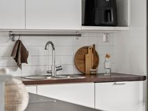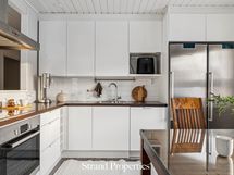 - Tilava keittiö uusittu 2011. Ikkunan eteen mahtuu iso ruokailuryhmä. Keittiössä on runsaasti työtaso- ja säilytystilaa, kaksi täysikorkuista kylmäkaappia sekä yksi seinänrivi pelkkää kaapistoa.