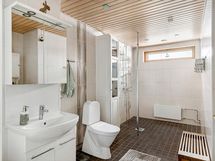 - Kylpyhuone, suihku, pesukoneliitäntä, peilikaappi, kiinteät valaisimet, allaskaappi.
