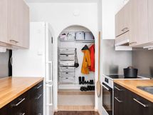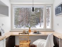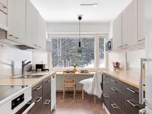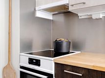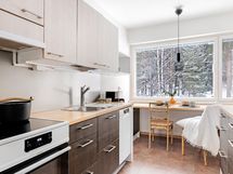 - Jääkaappi/pakastin, uuni, astianpesukone, kaapistot, keraaminen liesi, liesituuletin. Pöytätasot puuta, ikkunan edessä käytännöllinen pöytätaso.