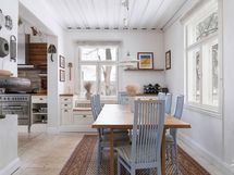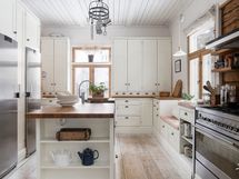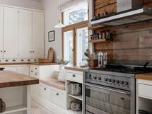 - Varustus: jäkaappi, pakastin, saarekkeessa mikro ja allas, astianpesukone, kaasuliesi, erillisuuni, liesikupu, avotakka (huippuimuri), puusepän tekemät kaapistot, ruokailutila keittiön yhteydessä, lankkulattia, hirsi/tapetti.