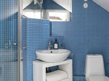 - Pesutilojen kuvaus: Alakerran kylpyhuoneessa vesikiertoinen lattialämmitys.