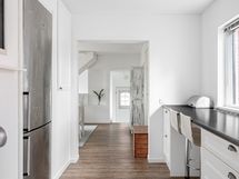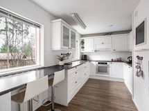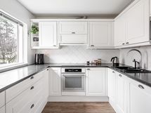 - Vaalea moderni keittiö, jossa hyvin kaappi- ja laskutilaa. Keittiön vieressä ruokailutila, josta käynti terassille. Jääkaappipakastin, induktio liesitaso, erillisuuni, liesituuletin, astianpesukone, mikroaaltouuni. Seinät maalattu ja lattia vinyyli.