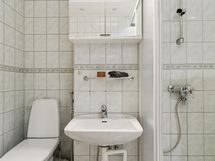- Kaunis täysin laatoitettu kylpyhuone, Varustus: Suihkukaappi, pesukoneliitäntä, peilikaappi. Kylpyhuone on remontoitu 2000-luvulla.