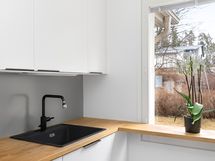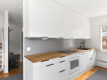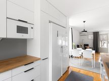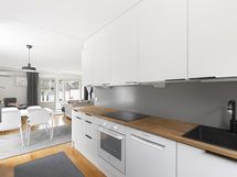 Korkea jääkaappi, korkea pakastin, induktioliesitaso, kalusteuuni, astianpesukone, integroitu mikroaaltouuni, liesituuletin, massiivipuutasot. Runsaasti kaapistoja- ja työskentelytilaa, ledivalot kaapistojen alla.