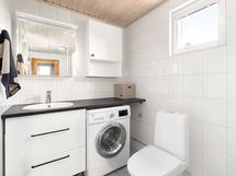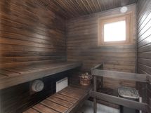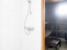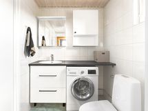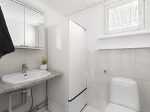 Suihku, suihkuseinä, peili- ja allaskaappi, pesukoneliitännät, paikka pesukoneelle, wc-istuin, käsisuihku, pyykkikaappi, lattialämmitys (sähköllä toimiva). Avattava ikkuna.