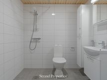 pyykinpesukoneelle ja kuivausrummulle tilavaraus. Varustus: pesukoneliitäntä, lattialämmitys, wc-istuin, suihku, peilikaappi, kiinteät valaisimet, kylpyhuonekaapisto.
