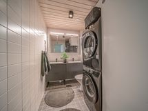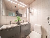 Pesutilojen kuvaus: Kaksi suihkua. Varustus: lattialämmitys, suihku, kiinteät valaisimet. Erillisen WC:n kuvaus: Erillinen wc. Varustus: pesukoneliitäntä, lattialämmitys, peilikaappi.