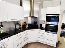 Tilaa isolle ruokapöydälle, Paljon kaappitilaa, Kivitasot, Astianpesukone, Integroidut koneet, Keraaminen liesi, Liesituuletin, Jääkaappi, Pakastin