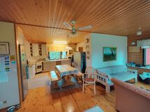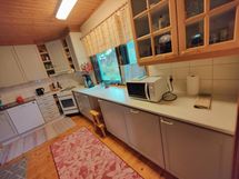 Tilaa isolle ruokapöydälle, Paljon kaappitilaa, Laminaattitasot, Astianpesukone, Pesukoneliitos, Sähköliesi, Liesituuletin, Puulattia