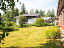Aurinkoinen ja huolella hoidettu takapiha kutsuu viettämään kesäpäiviä omassa rauhassa. Perennaistutukset, omenapuu ja pensaat luovat vehreän ympäristön ja tilaa riittää myös hyötypuutarhalle.