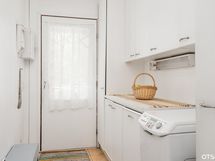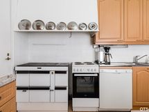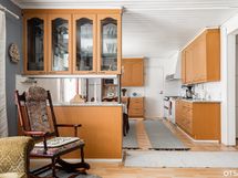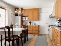 Keittiön varusteet: Jääkaappipakastin (2024), astianpesukone, liesituuletin ja uuni (2019). Liesi: Valurautaliesi. Työtason materiaali: Laminaatti. Keittiö remontoitu 1990-luvulla.