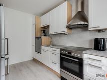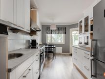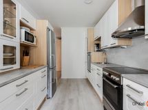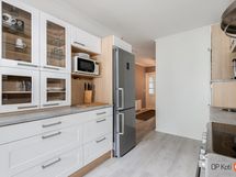 - Jääkaappipakastin, lattialiesi, keraaminen liesi, liesituuletin, astianpesukone, kaapistot.
