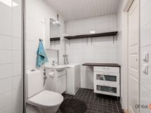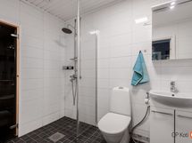 - Sauna, sähkökiuas, suihku, suihkuseinä, peilikaappi, allaskaappi, pesukoneliitäntä, lattialämmitys.