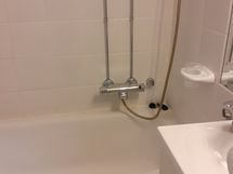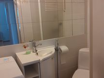 - Suihku, Suihkuseinä, Kylpyamme, Pesukone, Peilikaappi, Allaskaappi, Laattalattia, Laattaseinä, Lattialämmitys; Kylpyhuone vesieristetty säädösten mukaisesti, laatoitettu lattia ja seinät sekä lattialämmitys asennettu.