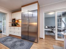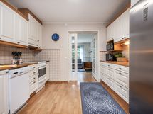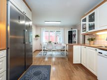 - Keittiön varusteet: Astianpesukone, uuni, liesi, liesituuletin, jääkaappi ja erillinen pakastin. Liesi: Keraaminen liesi. Työtason materiaali: Laminaatti.