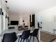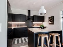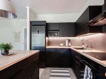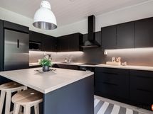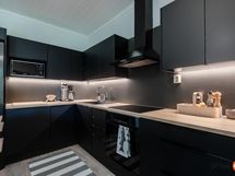 - Jääkaappipakastin, erillisuuni, induktioliesi, liesituuletin, mikroaaltouuni, astianpesukone integroitu, kaapistot, kiinteät valaisimet. Huusholli-keittiön kalusteet