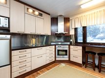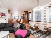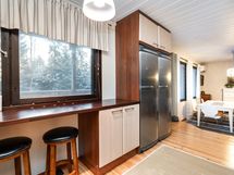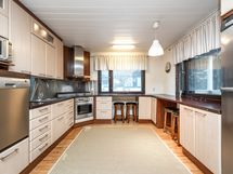 - Keittiön varusteet: Astianpesukone, liesi, erillisuuni, liesituuletin, jääkaappi ja pakastinkaappi. Työtason materiaali: Laminaatti. Tilava keittiö rosterikodinkoneineen. Avoin yhteys olohuoneeseen ja suora kulku katetulle terassille luovat toimivan kokonaisuuden.