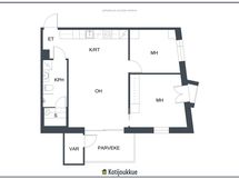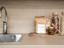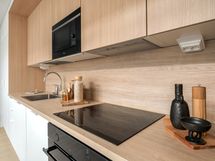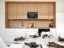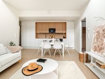 Keittiö ja olohuone muodostavat yhtenäisen, toimivan tilan, joka soveltuu niin arjen sujuvuuteen kuin juhlavampaan yhdessäoloon.