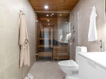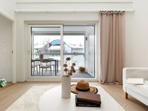 Huoneiston avara oleskelutila hurmaa valoisuudellaan ja selkeällä pohjaratkaisullaan. Suuret ikkunapinnat tuovat runsaasti luonnonvaloa ja korostavat tilan ilmavuutta. Arkkitehtoniset yksityiskohdat ja laadukkaat materiaalivalinnat tekevät kokonaisuudesta tyylikkään ja ajattoman.