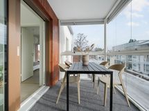 Kodin ehdoton helmi on tilava, lasitettu parveke. Tämä harvinainen ratkaisu tarjoaa valoa ja näkymiä eri ilmansuunnista sekä mahdollistaa parvekkeen käytön pitkälle syksyyn. Ylimmän kerroksen sijainti takaa rauhallisuuden ja yksityisyyden, täällä asut omassa rauhassasi kaupungin yläpuolella.
