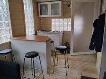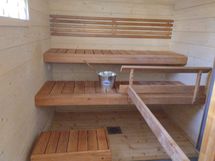 Ulkosaunassa seinänläpi lämmitettävä puukiuas kivikorein. Tuvan puolella minikeittiö, jossa hella ja jääkaappi, niiden yläpuolella kaapisto. Tuvassa baaritiski jakaa tuvan mukavasti kahteen osaan. Valaistus tuvassa himmennyksillä ja jokaisessa huonetilassa katossa kaiuttimet musiikin kuuntelua varten. Tuvassa erillinen antenniliitäntä televisiota varten. Tämä tila toimii vaikka tilapäis vierasmajoituksena tai illanistujaisten viettopaikkana. Lämmitys puulla tai sähköllä.