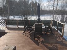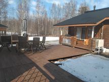 Takapihalla iso terassi, joka yhdistää talon erilliseen pihasaunaan. Terassin kaiteissa savunharmaa lasitus. Terassi rakennettu 2023.