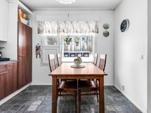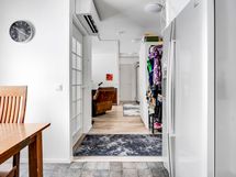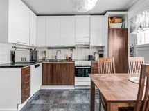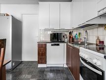 - Keittiön varusteet: Jääkaappipakastin, astianpesukone ja liesituuletin. Liesi: Keraaminen liesi. Työtason materiaali: Laminaatti.