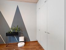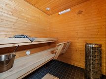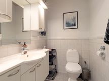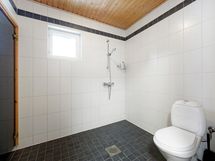 Kylpyhuone (lattialämmitys), suihku, sähkösauna (kiuas uusittu 2025), erillinen wc jossa alla- ja peilikaappi