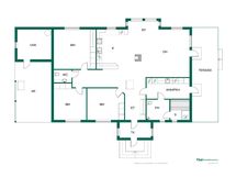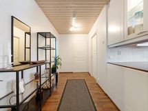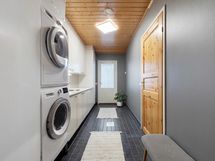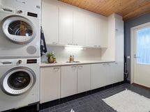 Käytännöllinen pohjaratkaisu yhdistää arjen sujuvuuden ja viihtyisän oleskelun. Kodinhoitohuoneesta ja olohuoneesta on käynti katetulle terassille.