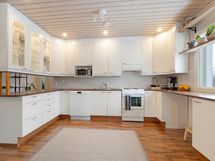 Jääkaappi (2021), pakastin (2021), astianpesukone (Bosch), sähköliesi ja uuni (Upo), liesikupu/-tuuletin