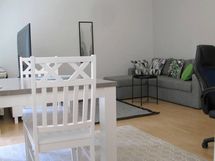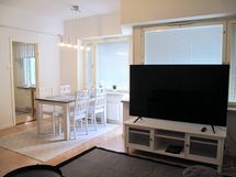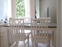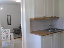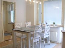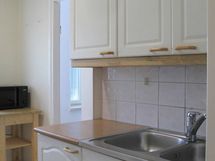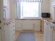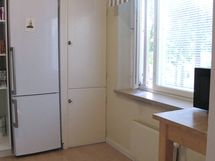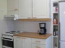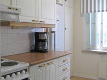 - Jääpakastinkaappi, sähköliesi, liesituuletin, apk-liitäntä, valkoiset kaapistot, tila pienelle ruokapöydälle. Ruokailutila olohuoneen puolella.
