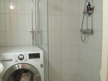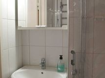 - Pesutilojen kuvaus: Laatoitetussa kylpyhuoneessa wc-istuin, pesuallas, peilikaappi, suihku, taittuva suihkuseinä, pk-liitäntä, lattialämmitys sähköllä.