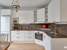 Jääkaappi/pakastin, liesituuletin, keraaminen liesitaso, erillisuuni, astianpesukone.