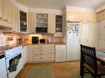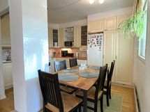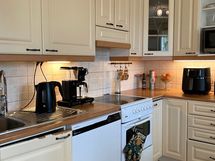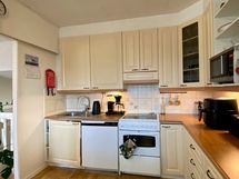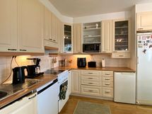 - Täyskorkea jääkaappi, pakastinkaappi, sähköliesi keraamisella keittotasolla, liesituuletin, astianpesukone (uusittu 2024), vaaleat kaapistot.